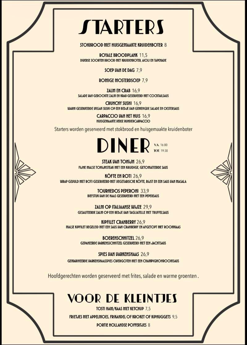 Onze lunches worden geserveerd van 11.00 uur tot 16.00 uur en onze starters en diners worden geserveerd van 16.00 uur tot 19.30 uur. Wij serveren de gehele dag door bittergarnituur. Ook is er koffie met gebak.